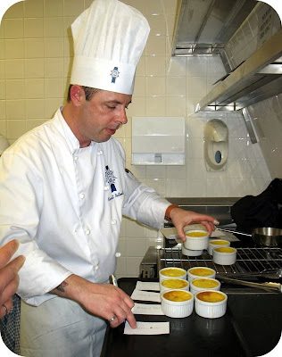S and I spent the night before Valentine's Day at a cooking class put on by Ottawa's Le Cordon Bleu. It was a really fun evening. We made three dishes — a shrimp and anise appetizer, a creamy cauliflower and leek soup, and for dessert, crème caramel à l'orange with marmelade sauce — in one of the school's big demonstration kitchens. The idea was to learn how to make a wonderful Valentine's Day dinner that you could repeat the next day at home.