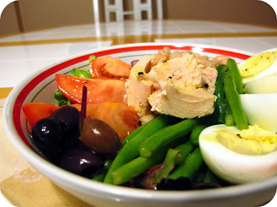 Salade niçoise is a composed salad, meaning ingredients are placed beside each other instead of tossed. I think it's a more interesting way of eating because it turns the salad into a more tapas-like experience. Composed salads have also been the subject of some very engaging culinary writing. I found this article in The Guardian and this one in the NY Times.